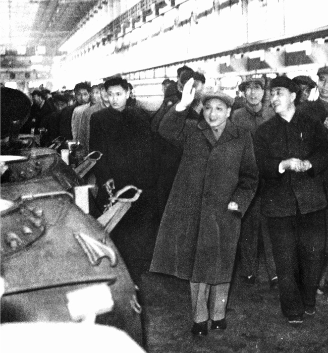 1964年4月8日中共中央總書(shū)記鄧小平視察617廠時(shí)在總裝車間向干部職工招手致意