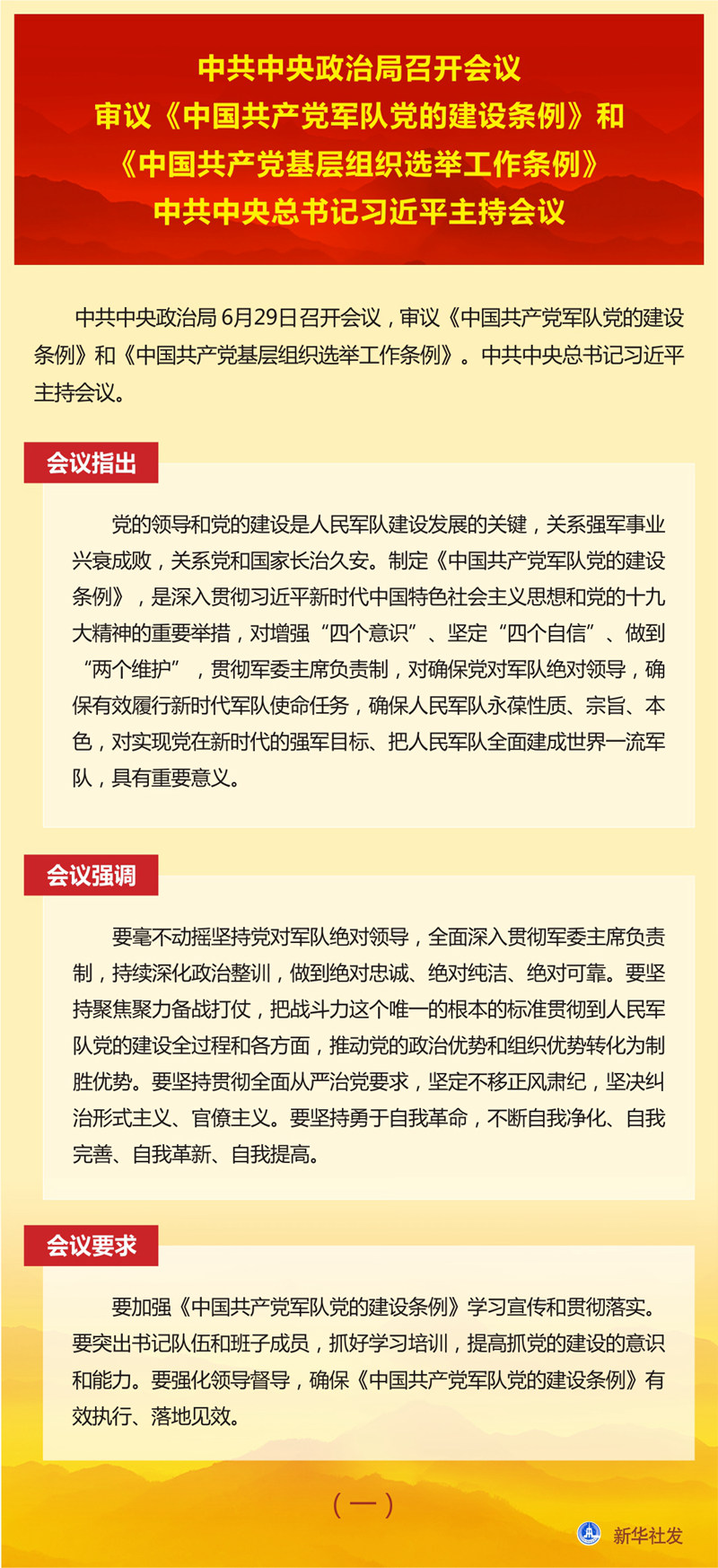 中共中央政治局召開會(huì)議 審議《中國共產(chǎn)黨軍隊(duì)黨的建設(shè)條例》和《中國共產(chǎn)黨基層組織選舉工作條例》 中共中央總書記習(xí)近平主持會(huì)議 新華社北京6月29日電 中共中央政治局6月29日召開會(huì)議,審議《中國共產(chǎn)黨軍隊(duì)黨的建設(shè)條例》和《中國共產(chǎn)黨基層組織選舉工作條例》。中共中央總書記習(xí)近平主持會(huì)議。 會(huì)議指出,黨的領(lǐng)導(dǎo)和黨的建設(shè)是人民軍隊(duì)建設(shè)發(fā)展的關(guān)鍵,關(guān)系強(qiáng)軍事業(yè)興衰成敗,關(guān)系黨和國家長治久安。制定《中國共產(chǎn)黨軍隊(duì)黨的建設(shè)條例》,是深入貫徹習(xí)近平新時(shí)代中國特色社會(huì)主義思想和黨的十九大精神的重要舉措,對(duì)增強(qiáng)“四個(gè)意識(shí)”、堅(jiān)定“四個(gè)自信”、做到“兩個(gè)維護(hù)”,貫徹軍委主席負(fù)責(zé)制,對(duì)確保黨對(duì)軍隊(duì)絕對(duì)領(lǐng)導(dǎo),確保有效履行新時(shí)代軍隊(duì)使命任務(wù),確保人民軍隊(duì)永葆性質(zhì)、宗旨、本色,對(duì)實(shí)現(xiàn)黨在新時(shí)代的強(qiáng)軍目標(biāo)、把人民軍隊(duì)全面建成世界一流軍隊(duì),具有重要意義。 會(huì)議強(qiáng)調(diào),要毫不動(dòng)搖堅(jiān)持黨對(duì)軍隊(duì)絕對(duì)領(lǐng)導(dǎo),全面深入貫徹軍委主席負(fù)責(zé)制,持續(xù)深化政治整訓(xùn),做到絕對(duì)忠誠、絕對(duì)純潔、絕對(duì)可靠。要堅(jiān)持聚焦聚力備戰(zhàn)打仗,把戰(zhàn)斗力這個(gè)唯一的根本的標(biāo)準(zhǔn)貫徹到人民軍隊(duì)黨的建設(shè)全過程和各方面,推動(dòng)黨的政治優(yōu)勢和組織優(yōu)勢轉(zhuǎn)化為制勝優(yōu)勢。要堅(jiān)持貫徹全面從嚴(yán)治黨要求,堅(jiān)定不移正風(fēng)肅紀(jì),堅(jiān)決糾治形式主義、官僚主義。要堅(jiān)持勇于自我革命,不斷自我凈化、自我完善、自我革新、自我提高。 會(huì)議要求,要加強(qiáng)《中國共產(chǎn)黨軍隊(duì)黨的建設(shè)條例》學(xué)習(xí)宣傳和貫徹落實(shí)。要突出書記隊(duì)伍和班子成員,抓好學(xué)習(xí)培訓(xùn),提高抓黨的建設(shè)的意識(shí)和能力。要強(qiáng)化領(lǐng)導(dǎo)督導(dǎo),確保《中國共產(chǎn)黨軍隊(duì)黨的建設(shè)條例》有效執(zhí)行、落地見效。 會(huì)議指出,黨的十八大以來,以習(xí)近平同志為核心的黨中央高度重視基層黨組織選舉工作,對(duì)堅(jiān)持和加強(qiáng)黨的全面領(lǐng)導(dǎo)、貫徹執(zhí)行民主集中制、規(guī)范完善黨內(nèi)選舉制度作出一系列重大部署,有力推動(dòng)了基層黨組織建設(shè)。制定和實(shí)施《中國共產(chǎn)黨基層組織選舉工作條例》,是落實(shí)黨要管黨、全面從嚴(yán)治黨要求,是發(fā)揚(yáng)黨內(nèi)民主、尊重黨員民主權(quán)利、規(guī)范基層黨組織選舉的具體舉措,對(duì)增強(qiáng)基層黨組織政治功能和組織力,把基層黨組織建設(shè)成為宣傳黨的主張、貫徹黨的決定、領(lǐng)導(dǎo)基層治理、團(tuán)結(jié)動(dòng)員群眾、推動(dòng)改革發(fā)展的堅(jiān)強(qiáng)戰(zhàn)斗堡壘,鞏固黨長期執(zhí)政的組織基礎(chǔ),具有重要意義。 會(huì)議強(qiáng)調(diào),要嚴(yán)格執(zhí)行選舉制度規(guī)定,提高黨內(nèi)選舉質(zhì)量,保障黨章賦予的黨員權(quán)利,增強(qiáng)黨的意識(shí)、政治意識(shí)、規(guī)矩意識(shí)。要嚴(yán)格代表資格條件,確保選出合格的代表。要合理分配代表名額,優(yōu)化代表結(jié)構(gòu),確保生產(chǎn)和工作一線代表比例。要按照德才兼?zhèn)?、以德為先和班子結(jié)構(gòu)合理的原則提名委員候選人。要堅(jiān)持教育在先、警示在先、預(yù)防在先,嚴(yán)肅政治紀(jì)律、組織紀(jì)律和換屆紀(jì)律,確保選舉風(fēng)清氣正。 會(huì)議要求,各級(jí)黨委要加強(qiáng)對(duì)《中國共產(chǎn)黨基層組織選舉工作條例》實(shí)施的組織領(lǐng)導(dǎo),嚴(yán)格落實(shí)黨委主體責(zé)任,加強(qiáng)謀劃,精心組織,全程把關(guān)。要貫徹執(zhí)行民主集中制,教育引導(dǎo)黨員和代表正確行使民主權(quán)利,保證選舉工作平穩(wěn)有序。要強(qiáng)化基層黨組織書記和黨務(wù)骨干培訓(xùn),提升工作規(guī)范化水平。要加強(qiáng)督促落實(shí),確?!吨袊伯a(chǎn)黨基層組織選舉工作條例》各項(xiàng)規(guī)定要求落到實(shí)處。 會(huì)議還研究了其他事項(xiàng)。 |