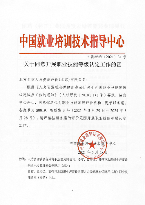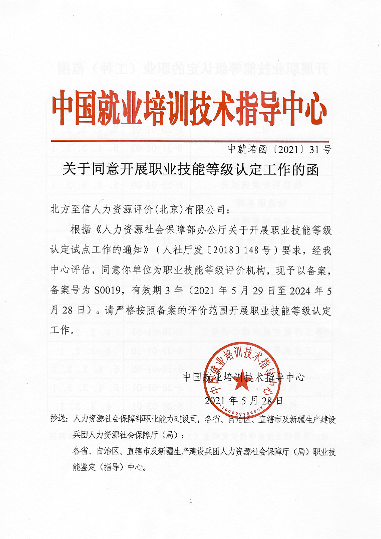 5月28日,人力資源社會保障部中國就業(yè)培訓(xùn)技術(shù)指導(dǎo)中心發(fā)布了《關(guān)于同意開展職業(yè)技能等級認定工作的函》(中就培函〔2021〕31號),北方至信人力資源評價(北京)有限公司(以下簡稱“北方至信”)成為首家央企全國性社會培訓(xùn)評價組織職業(yè)技能等級認定機構(gòu)。