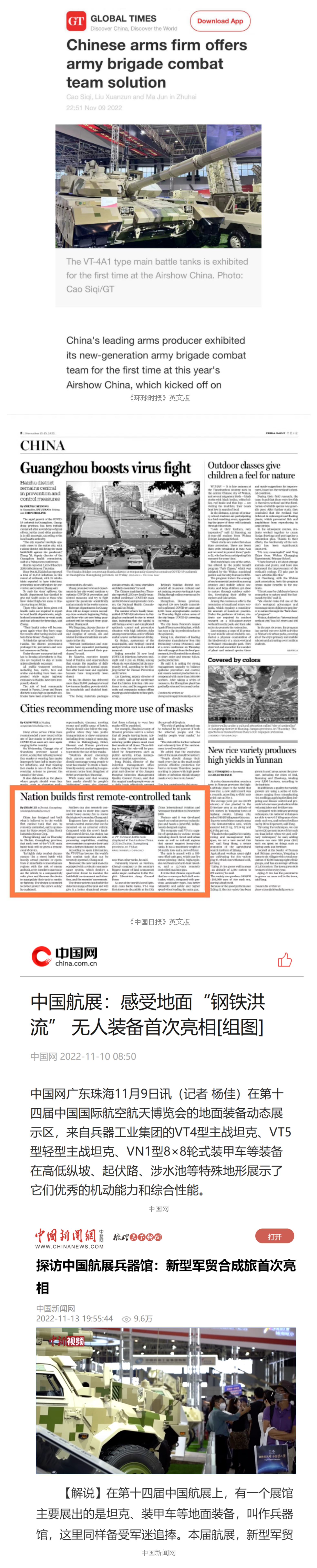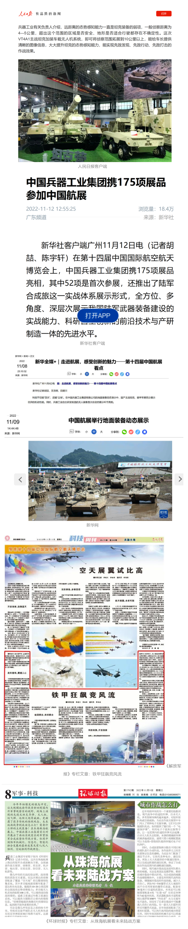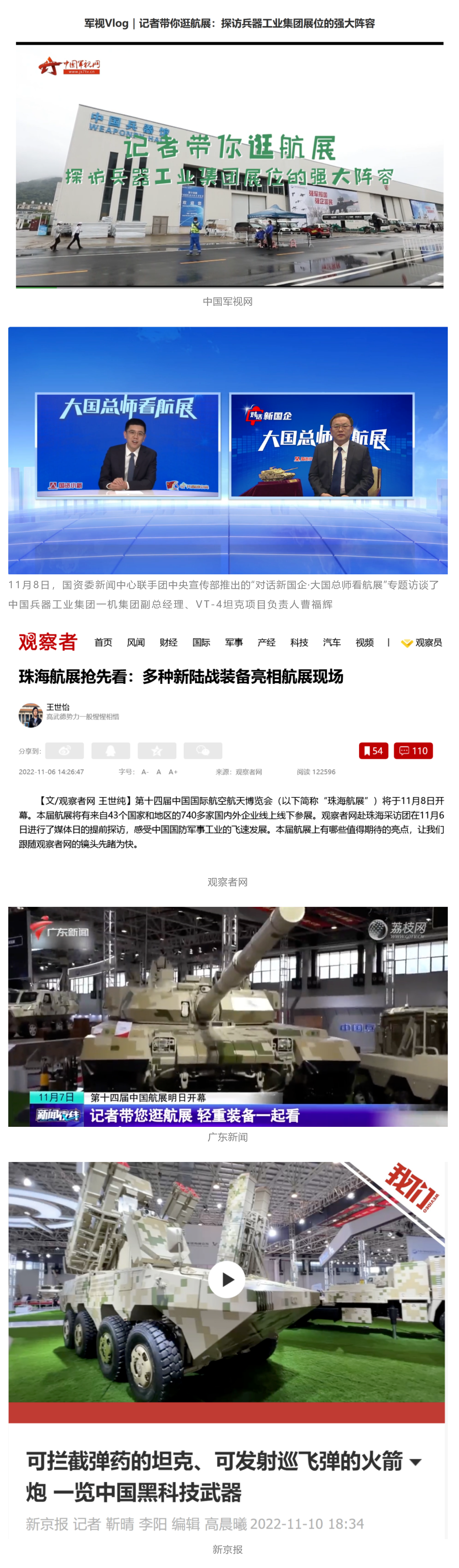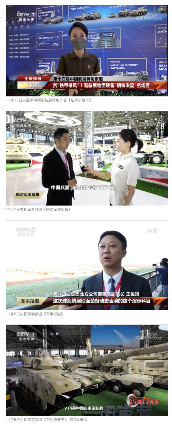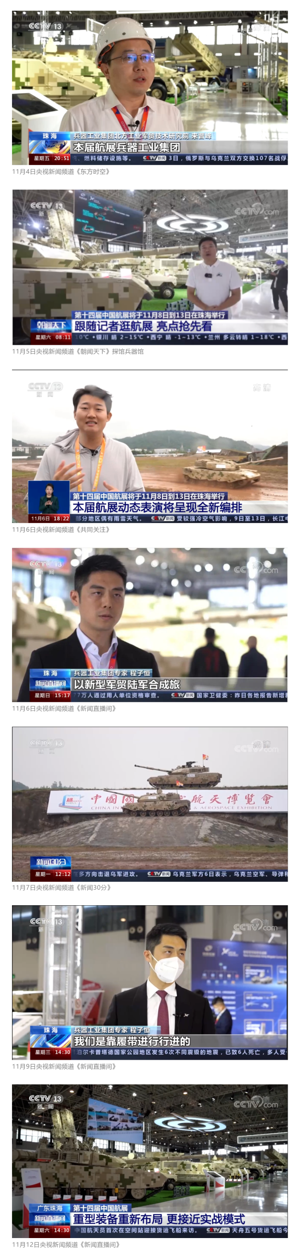 央視國防軍事頻道航展特別報道《炫舞天地間》11月12日《賞“鐵甲雄風(fēng)”!看航展地面裝備“鋼鐵洪流”名場面》對兵器工業(yè)集團武器裝備特色亮點進行報道。《國防軍事早報》11月7日推出報道《第十四屆中國國際航空航天博覽會明天開幕 中國兵器館首次以陸軍合成旅實戰(zhàn)體系形式展出》,對兵器館陸軍合成旅實戰(zhàn)體系進行報道?!盾娛聢蟮馈?1月9日推出《第十四屆中國國際航空航天博覽會 地面兵器裝備首次聯(lián)合陸航直升機進行動態(tài)展示》報道。《軍迷行天下》11月9日推出報道《軍迷打卡航展2022》以專業(yè)軍迷視角探館兵器館,全面展示兵器工業(yè)集團參展裝備特色亮點。