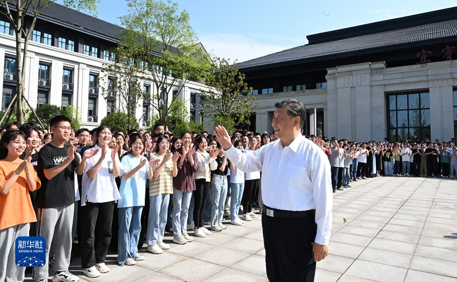 6月8日,中共中央總書記、國家主席、中央軍委主席習(xí)近平在四川考察。這是8日下午,習(xí)近平在宜賓學(xué)院考察時,向師生們揮手致意。新華社記者 姚大偉 攝