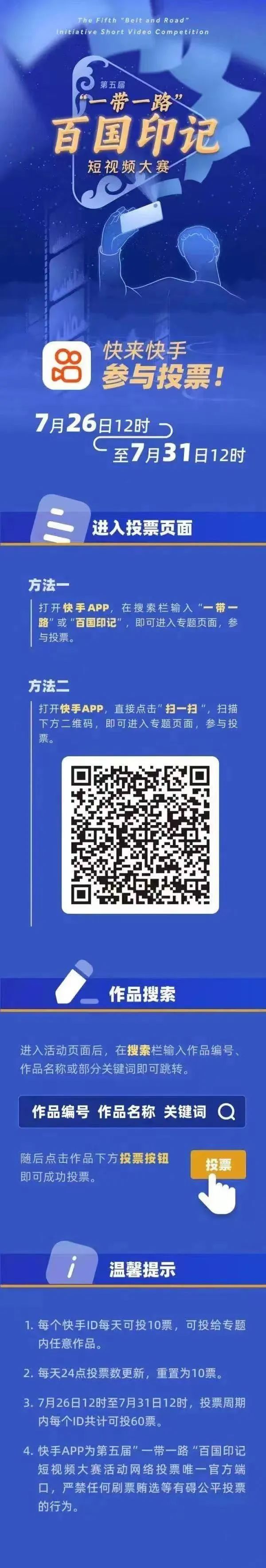 7月26日,由外交部新聞司、中央網(wǎng)信辦網(wǎng)絡(luò)傳播局指導(dǎo),中國公共外交協(xié)會、國務(wù)院國資委新聞中心、環(huán)球網(wǎng)聯(lián)合主辦的第五屆“一帶一路”百國印記短視頻大賽完成作品征集,正式開啟投票階段。