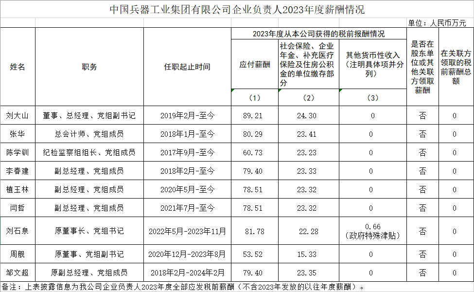 中國兵器工業(yè)集團有限公司企業(yè)負責(zé)人2023年度薪酬情況 |