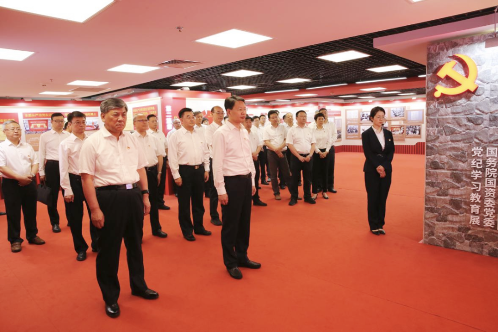 黨組同志認真聆聽講解,集體參觀了“政治鑄魂——習近平總書記重要論述”“紀法樹威——黨規(guī)黨紀相關(guān)要求”“傳承增信——黨的優(yōu)良傳統(tǒng)”“嚴管促行——國務院國資委黨委紀律建設成效”“警示立戒——反面典型案例”“實干建功——工作展望”6個篇章,通過觀看圖文、視頻等形式多樣的展品展示,進一步學習領(lǐng)會習近平總書記關(guān)于國資央企的重要指示批示精神和黨的紀律建設的重要論述,學習把握《中國共產(chǎn)黨紀律處分條例》新增、修訂內(nèi)容,全面了解國務院國資委黨委強化政治引領(lǐng)、加強政治監(jiān)督、深化紀律建設、抓實巡視工作等方面的做法舉措,集中觀看近年來國資央企發(fā)生的具有代表性的違規(guī)違紀案例,深刻領(lǐng)悟以習近平同志為核心的黨中央堅持黨要管黨、全面從嚴治黨取得的歷史性成就,全面感受國務院國資委黨委全面從嚴治黨取得的重要成果。