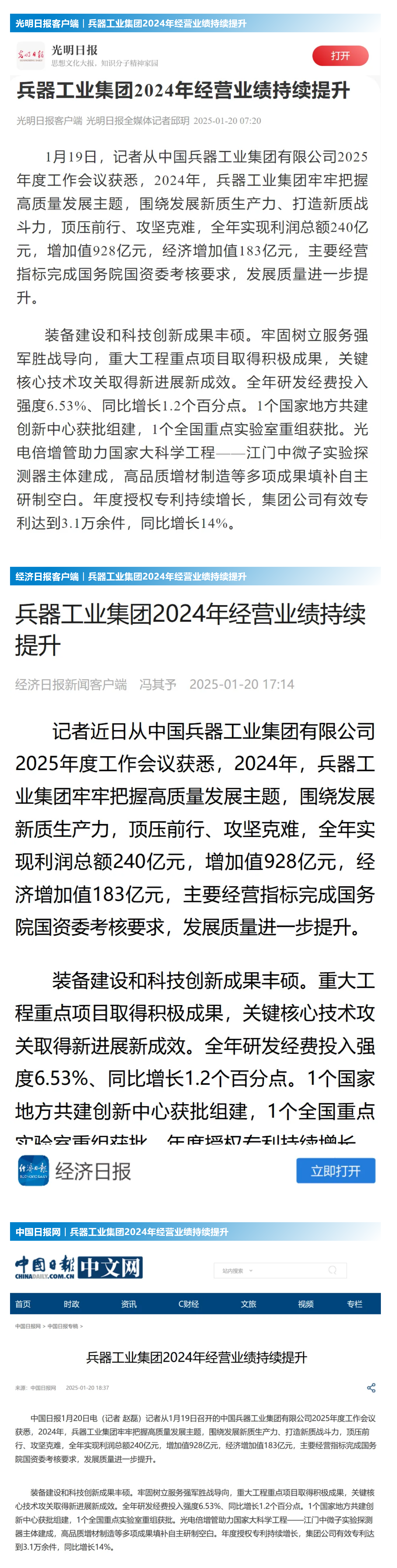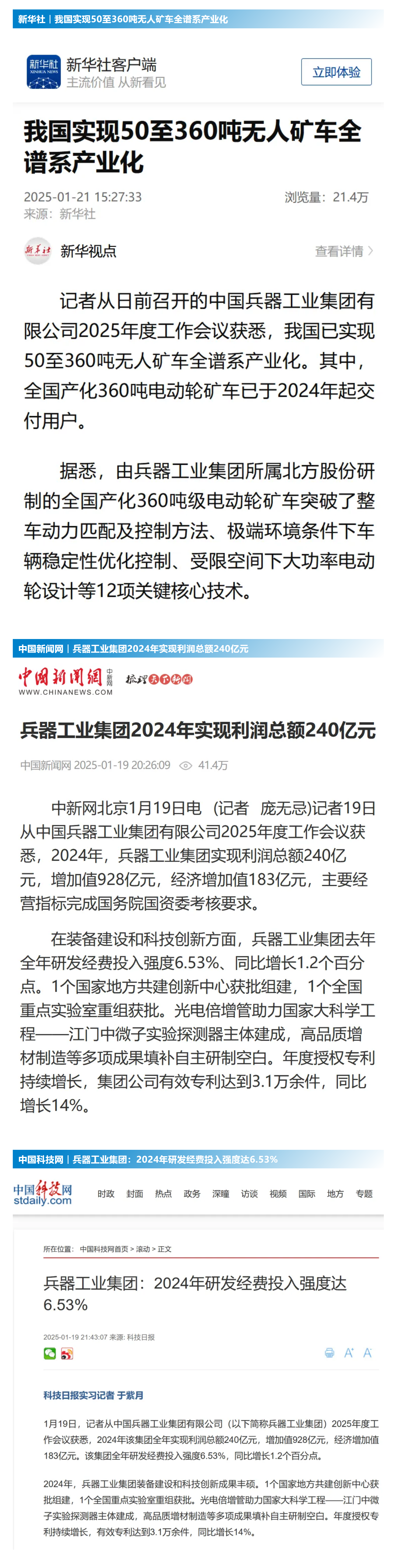 1月19日至20日,中國兵器工業(yè)集團有限公司2025年度工作會議在京召開,會議總結2024年工作,分析形勢任務,明確工作思路,部署2025年工作。 集團公司2024年取得的成績及下一步重點工作受到社會媒體廣泛關注。新華社、中國新聞網(wǎng)、中國科技網(wǎng)、光明日報客戶端、經(jīng)濟日報客戶端、中國日報網(wǎng)、國務院國資委網(wǎng)站、學習強國中央企業(yè)學習平臺、新浪網(wǎng)、網(wǎng)易網(wǎng)、搜狐網(wǎng)、騰訊網(wǎng)、鳳凰網(wǎng)等中央主流媒體、國家部委網(wǎng)站及知名網(wǎng)絡媒體對集團公司2025年度工作會議進行了報道,重點關注集團公司經(jīng)營業(yè)績、科技創(chuàng)新、產(chǎn)業(yè)結構布局優(yōu)化等情況。其中,新華社以《我國實現(xiàn)50至360噸無人礦車全譜系產(chǎn)業(yè)化》為題,重點報道了集團公司在推動智能制造水平提升方面取得的成效;中國新聞網(wǎng)、光明日報客戶端、經(jīng)濟日報客戶端、中國日報網(wǎng)等就集團公司2024年度經(jīng)營業(yè)績及各項工作取得的成果進行報道;中國科技網(wǎng)著重報道了集團公司在科技創(chuàng)新和優(yōu)化產(chǎn)業(yè)結構布局方面的最新進展。集團公司門戶網(wǎng)站、微信公眾號、微博等新媒體平臺以及《中國兵工報》也對集團公司工作會議進行了及時報道,各成員單位紛紛對相關內(nèi)容進行轉載,引發(fā)全系統(tǒng)關注。 集團公司職工及廣大網(wǎng)友熱議工作會 “2025年工作會為我們指明了發(fā)展方向、明確了奮斗目標,面對全新的機遇和挑戰(zhàn),作為兵工人深感責任重大?!?/p> “科技是第一生產(chǎn)力,一定要以科技創(chuàng)新引領新質生產(chǎn)力發(fā)展,為高質量發(fā)展提供支撐?!?/p> “把各項工作做深、做實、做細,努力為集團公司高質量發(fā)展添磚加瓦。” “2024年中國兵器展示了大國重器,祝新的一年中再創(chuàng)輝煌!” |
