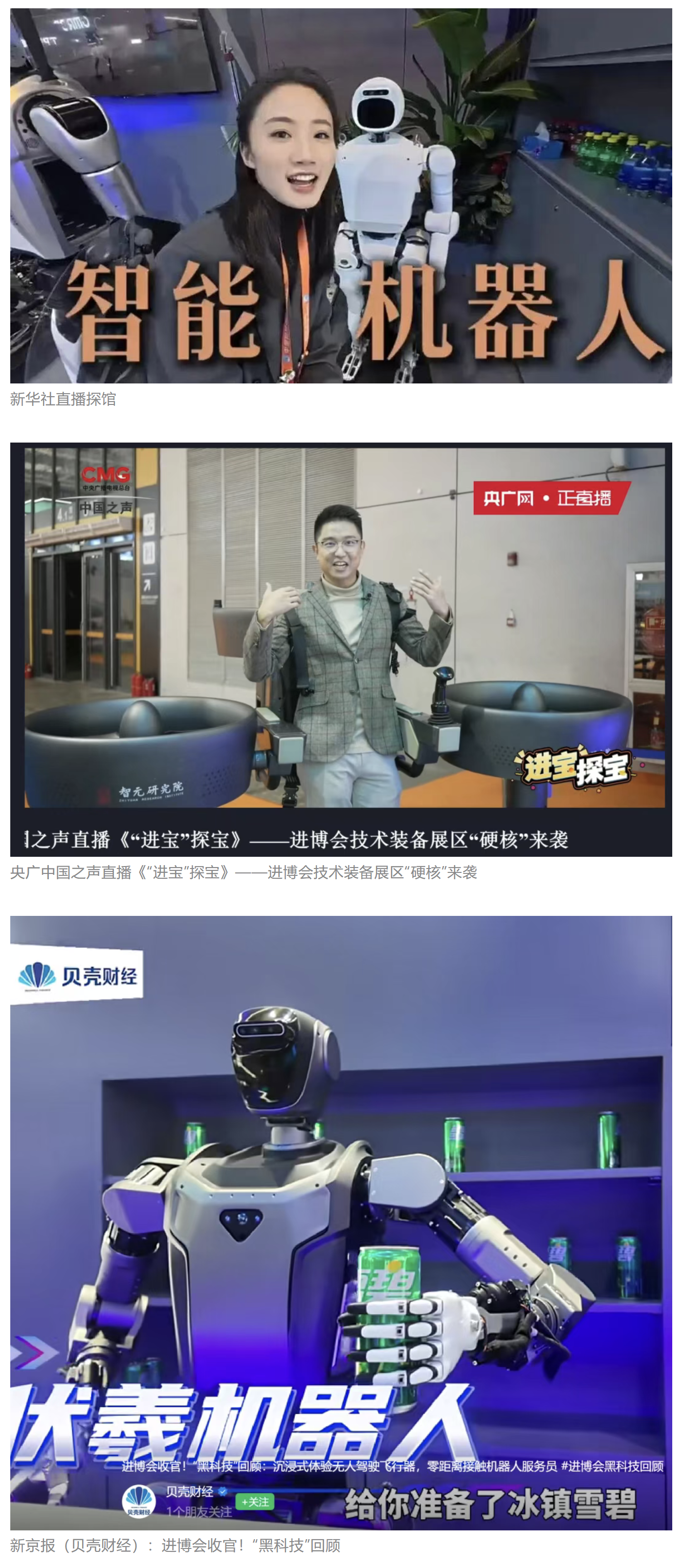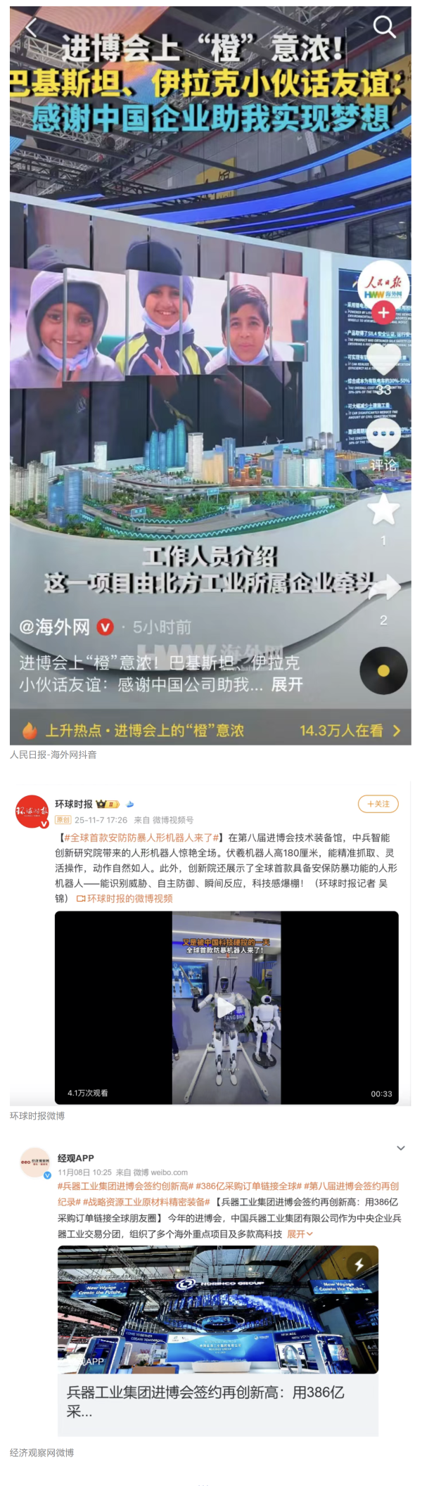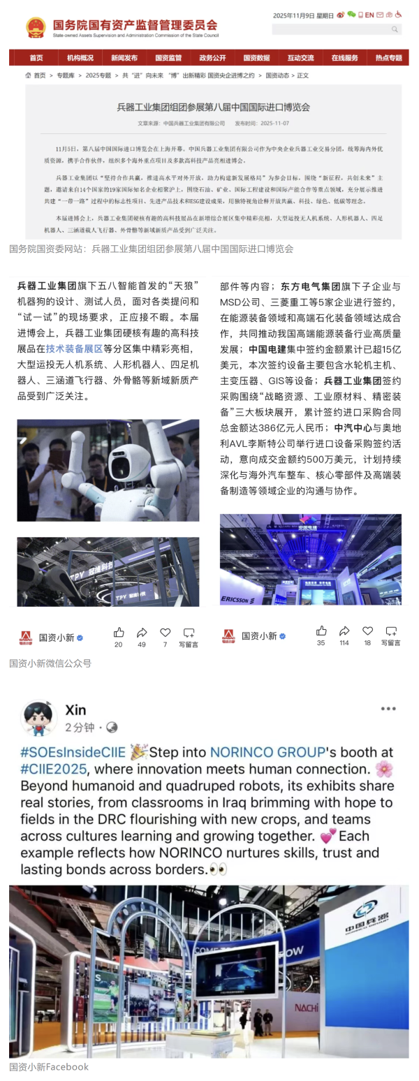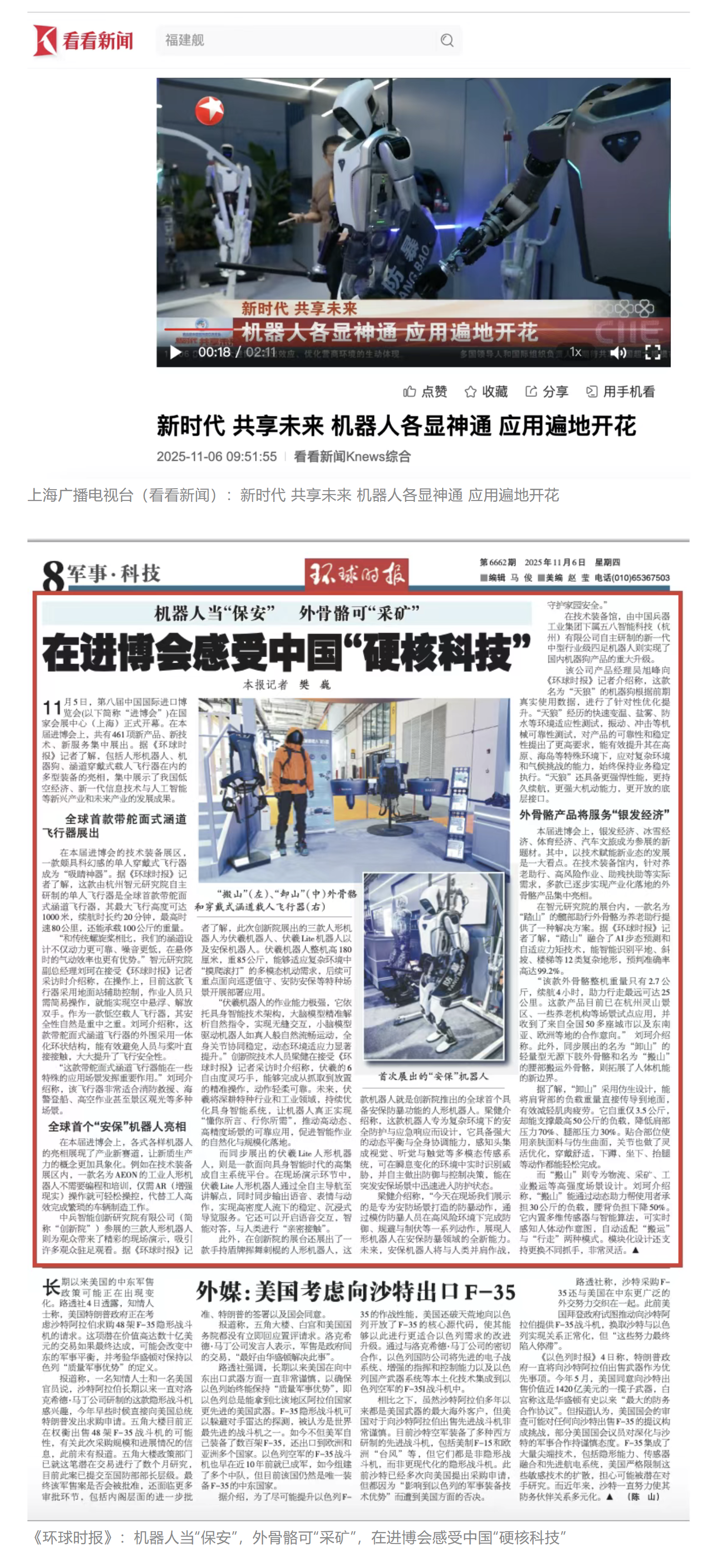 11月5日至10日,中國(guó)兵器工業(yè)集團(tuán)有限公司組團(tuán)參加第八屆中國(guó)國(guó)際進(jìn)口博覽會(huì)。集團(tuán)公司以“堅(jiān)持合作共贏,推進(jìn)高水平對(duì)外開(kāi)放,助力構(gòu)建新發(fā)展格局”為目標(biāo),圍繞“新征程,共創(chuàng)未來(lái)”主題組團(tuán)參展,集中展示了一系列新技術(shù)、新理念、新成果,取得豐碩成果,受到廣泛關(guān)注。 嘉賓云集 本屆進(jìn)博會(huì)上,蒙古國(guó)駐華大使、贊比亞礦業(yè)和礦產(chǎn)開(kāi)發(fā)部常任秘書(shū)、津巴布韋首席司長(zhǎng)等多國(guó)政要蒞臨集團(tuán)公司組展展區(qū),了解有關(guān)項(xiàng)目情況。 國(guó)家能源集團(tuán)、東風(fēng)汽車、哈電集團(tuán)、鞍鋼集團(tuán)、中鋁集團(tuán)、通用技術(shù)集團(tuán)、中國(guó)中車、中國(guó)長(zhǎng)安汽車、中國(guó)電建等央企領(lǐng)導(dǎo),工信部、國(guó)務(wù)院國(guó)資委、中國(guó)貿(mào)促會(huì)、陜西省、上海市、浙江省等國(guó)內(nèi)政府部門領(lǐng)導(dǎo)以及國(guó)內(nèi)外合作伙伴蒞臨集團(tuán)公司組展展區(qū)參觀指導(dǎo)。對(duì)集團(tuán)公司高質(zhì)量共建“一帶一路”,與各國(guó)合作伙伴共享發(fā)展機(jī)遇、實(shí)現(xiàn)互利共贏給予高度評(píng)價(jià)。 媒體關(guān)注 集團(tuán)公司集中簽約亮相央視綜合頻道《新聞聯(lián)播》、央視新聞?lì)l道《朝聞天下》《新聞30分》《共同關(guān)注》、央視財(cái)經(jīng)頻道《正點(diǎn)財(cái)經(jīng)》《經(jīng)濟(jì)信息聯(lián)播》。 《環(huán)球時(shí)報(bào)》、環(huán)球網(wǎng)、《新京報(bào)》、《中國(guó)旅游報(bào)》等對(duì)集團(tuán)公司人形機(jī)器人、四足機(jī)器人、涵道穿戴式載人飛行器、外骨骼等多型新域新質(zhì)產(chǎn)品,集中亮相進(jìn)行報(bào)道。新華社、央廣中國(guó)之聲、新京報(bào)(貝殼財(cái)經(jīng))、上海廣播電視臺(tái)等媒體直播探館,打卡兵器“硬核科技”。 人民日?qǐng)?bào)客戶端、新華社客戶端、人民網(wǎng)、中國(guó)網(wǎng)、中國(guó)日?qǐng)?bào)網(wǎng)、國(guó)務(wù)院國(guó)資委網(wǎng)站、國(guó)資小新微信公眾號(hào)、國(guó)資小新Facebook、學(xué)習(xí)強(qiáng)國(guó)中央企業(yè)學(xué)習(xí)平臺(tái)、經(jīng)濟(jì)觀察網(wǎng)、新京報(bào)客戶端等第一時(shí)間刊發(fā)集團(tuán)公司組展簽約、ESG建設(shè)等情況。新浪財(cái)經(jīng)、界面新聞等商業(yè)平臺(tái)閱讀量累計(jì)超500萬(wàn)次。 在微博、抖音等新媒體平臺(tái)上,集團(tuán)公司高科技產(chǎn)品演示、5D穹幕電影體驗(yàn)等短視頻持續(xù)引爆流量,累計(jì)播放量超800萬(wàn)次,點(diǎn)贊量破50萬(wàn)?!氨鞴I(yè)集團(tuán)進(jìn)博會(huì)簽約386億”相關(guān)話題登上微博熱搜榜,閱讀量破5000萬(wàn)次。 文字丨劉暢 |